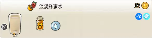 淡淡蜂蜜水(中杯) 出售原价:12 状态:常温/加冰,无糖 配方:蜂蜜×1+水×3,搅拌 等级:0.5星