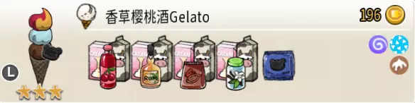 香草樱桃酒冰淇淋(三层甜筒) 出售原价:196 状态:粗冰激凌/细冰激凌,无酱/加酱 配方:芝麻蛋筒+可可味冰激凌×1+香草味冰激凌×1+(樱桃味冰激凌+朗姆酒味冰激凌,双色)×1(按序),黑曲奇×1(装饰) 等级:3星
