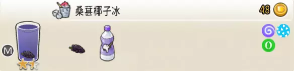 桑葚椰子冰(中杯) 出售原价:48 状态:粗沙冰/细沙冰,无糖/加代糖 配方:(桑葚×2+冰块×1,破壁)+酸奶×1,桑葚×1(小料),搅拌 等级:1.5星