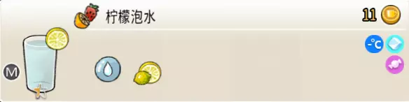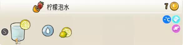 柠檬泡水(小杯) 出售原价:7 状态:常温/加冰,无糖/加糖 配方:水×2,鲜柠檬切片×1(装饰) 等级:0.5星