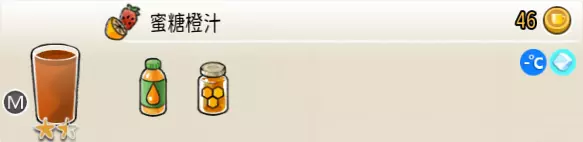 蜜糖橙汁(中杯) 出售原价:46 状态:常温/加冰,无糖 配方:橙汁×3+蜂蜜×1,搅拌 等级:1.5星