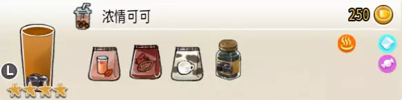 浓缩可可(大杯) 出售原价:250 状态:加冰/加热,无糖/加糖 配方:可可×2+速溶奶茶×1+香草糖浆×1,仙草冻×1(小料),搅拌 等级:4星