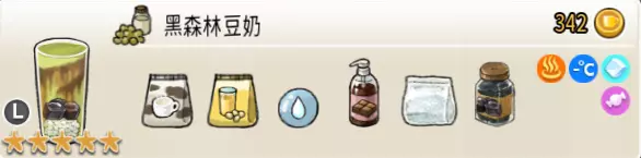 黑森林豆奶(大杯) 出售原价:342 状态:常温/加冰/加热,无糖/加糖 配方:巧克力酱×1(挂壁,最先制作),速溶牛奶×3+速溶豆浆×2+水×1,西米×1+仙草冻×1(小料,需煮制),搅拌 等级:5星