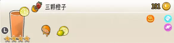 三颗橙子(大杯) 出售原价:181 状态:加冰/加热,无糖/加糖 配方:鲜橙×3,鲜柠檬切片×1(装饰) 等级:4星