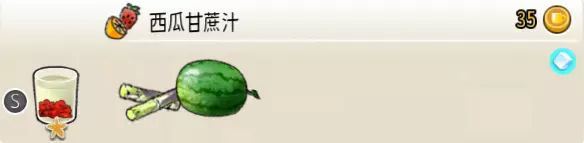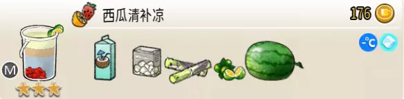 西瓜清补凉(超级杯) 出售原价:176 状态:常温/加冰,无糖 配方:西瓜块×1(棒打成酱,最先制作),椰汁×2+白糖糖水×1+甘蔗汁×1(顺序不限),鲜青桔切片×1(装饰用) 等级:3星