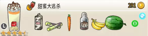 甜蜜大逃杀(大杯) 出售原价:291 状态:加冰,无糖/加代糖 配方:香蕉块×1(棒打成酱,最先做),鲜牛奶×2+甘蔗汁×3+胡萝卜汁×1(按序),西瓜块×1(小料),可可奶油×1(封顶,最后做) 等级:4.5星