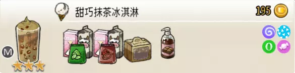 甜巧抹茶冰激凌(中杯) 出售原价:195 状态:粗沙冰/细沙冰,无糖/加糖/加代糖 配方:巧克力酱×1(挂壁,最先制作),抹茶味冰激凌×2+可可味冰激凌×2,布朗尼切块×2(小料,需搅碎),搅拌 等级:3星