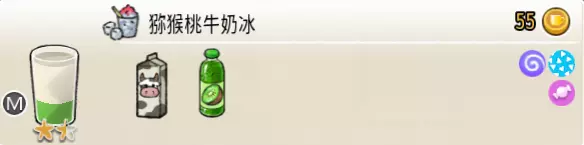 猕猴桃牛奶冰(中杯) 出售原价:55 状态:粗沙冰/细沙冰,无糖/加糖 配方:冷冻猕猴桃汁×1+(鲜牛奶×2+冰块×1,破壁)(按序) 等级:1.5星