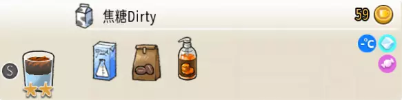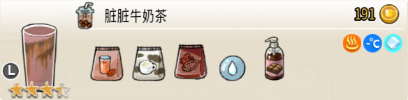 脏脏牛奶茶(大杯) 出售原价:191 状态:常温/加冰/加热,无糖 配方:巧克力酱×1(挂壁,最先做),可可×2+速溶奶茶×1+香草糖浆×1+水×2,搅拌 等级:3.5星