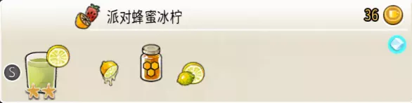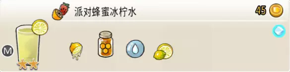 派对蜂蜜冰柠水(中杯) 出售原价:45 状态:加冰,无糖 配方:鲜柠檬×1+蜂蜜×1+水×2,鲜柠檬切片×1(装饰),搅拌 等级:2星