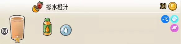 掺水橙汁(中杯) 出售原价:30 状态:常温/加冰,无糖/加糖 配方:橙汁×3+水×1,搅拌 等级:1星