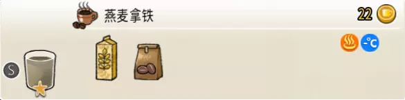 燕麦拿铁(小杯) 出售原价:22 状态:常温/加热,无糖 配方:咖啡×1+燕麦奶×1,搅拌 等级:1星
