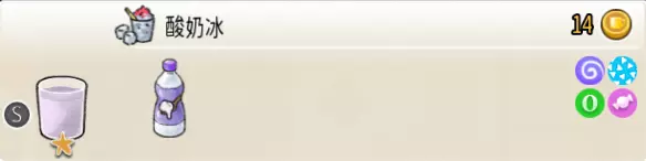 7-1 酸奶冰(小杯) 出售原价:14 状态:粗沙冰/细沙冰,无糖/加糖/加代糖 配方:酸奶×1+冰块×1,破壁 等级:1星