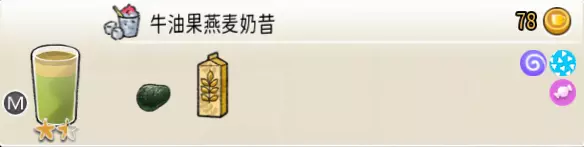 牛油果燕麦奶昔(中杯) 出售原价:78 状态:粗沙冰/细沙冰,无糖/加糖 配方:(牛油果块×2+冰块×1,破壁)+燕麦奶×1(按序) 等级:1.5星