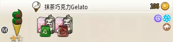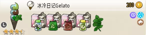 冰冷日记Gelato(三层甜筒) 出售原价:280 状态:粗冰激凌/细冰激凌,无酱/加酱 配方:芝麻蛋筒+(香草味冰激凌+抹茶味冰激凌,双色)×1+(香草味冰激凌+可可味冰激凌,双色)×1+(香草味冰激凌+开心果味冰激凌,双色)×1(按序),薄荷切片×1(装饰) 等级:3.5星