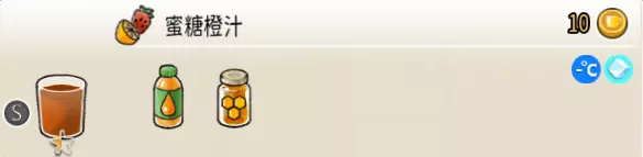 蜜糖橙汁(小杯) 出售原价:10 状态:常温/加冰,无糖 配方:蜂蜜×1+橙汁×1,搅拌 等级:0.5星