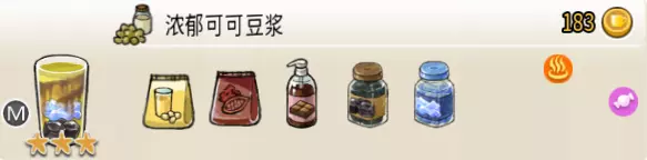 浓郁可可豆浆(中杯) 出售原价:183 状态:加热,无糖/加糖 配方:巧克力酱×1(挂壁,最先制作),速溶豆浆×3+可可×1,西米×1+仙草冻×1(小料,需煮制),搅拌 等级:3星