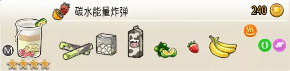 碳水能量炸弹(超级杯) 出售原价:240 状态:加热,无糖/加糖/加代糖 配方:草莓×1+香蕉块×1(棒打成酱,最先制作),甘蔗汁×2+白糖糖水×1+鲜牛奶×1(顺序不限),鲜青桔切片×1(装饰用) 等级:4星