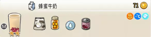 蜂蜜牛奶(中杯) 出售原价:71 状态:常温/加冰/加热,无糖 配方:速溶牛奶×1+蜂蜜×1+水×2,红豆×1(小料),搅拌 等级:2星