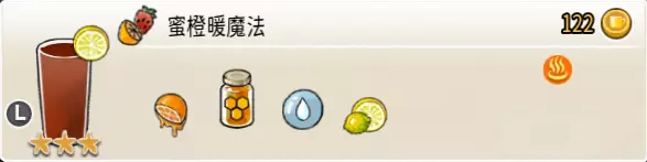 蜜橙暖魔法(大杯) 出售原价:122 状态:加热,无糖 配方:鲜橙×2+蜂蜜×1+水×1,鲜柠檬切片×1(装饰),搅拌 等级:3星