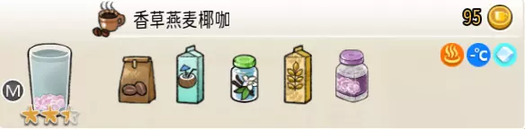 香草燕麦椰咖(中杯) 出售原价:95 状态:常温/加冰/加热,无糖 配方:咖啡×1+椰汁×1+香草糖浆×1+燕麦奶×1,脆波波×1(小料),搅拌 等级:2.5星