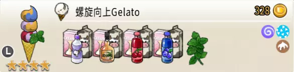 螺旋向上冰淇淋(三层甜筒) 出售原价:328 状态:粗冰激凌/细冰激凌,无酱/加酱 配方:原味蛋筒+(樱桃味冰激凌+酸奶味冰激凌,双色)×1+(酸奶味冰激凌+朗姆酒味冰激凌,双色)×1+(朗姆酒味冰激凌+蓝莓味冰激凌,双色)×1(按序),薄荷切片×1(装饰) 等级:4星