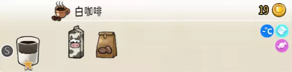 3-2 白咖啡(小杯) 出售原价:19 状态:常温/加冰,无糖/加糖 配方:鲜牛奶×1+咖啡×1(按序) 等级:1星