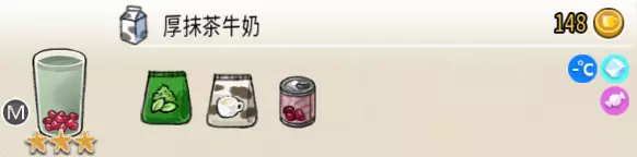厚抹茶牛奶(中杯) 出售原价:148 状态:常温/加冰,无糖/加糖 配方:速溶抹茶×2+速溶牛奶×2,红豆×1(小料),搅拌 等级:3星