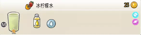 冰柠檬水(中杯) 出售原价:25 状态:加冰,无糖/加糖 配方:柠檬汁×2+水×2,搅拌 等级:1星