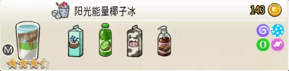 阳光能量椰子冰(中杯) 出售原价:143 状态:粗沙冰/细沙冰,无糖/加糖/加代糖 配方:巧克力酱×1(挂壁,最先制作),鲜牛奶×1+冷冻猕猴桃汁×1+(椰汁×1+冰块×1,破壁)(按顺序操作) 等级:3.5星