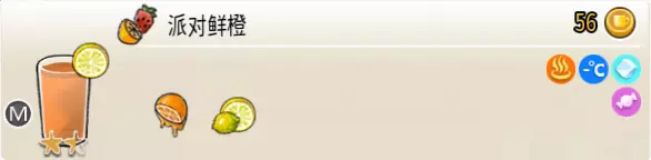 派对鲜橙(中杯) 出售原价:56 状态:常温/加冰/加热,无糖/加糖 配方:鲜橙×2,鲜柠檬切片×1(装饰) 等级:1.5星