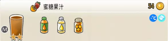 蜜糖果汁(中杯) 出售原价:54 状态:常温/加冰,无糖 配方:橙汁×2+蜂蜜×1+柠檬汁×1,搅拌 等级:2星