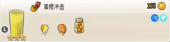 蜜橙冲击(大杯) 出售原价:155 状态:常温/加冰,无糖 配方:鲜橙×1+鲜柠檬×3+蜂蜜×1,搅拌 等级:3星