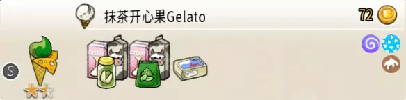 抹茶开心果冰淇淋(一层甜筒) 出售原价:72 状态:粗冰激凌/细冰激凌,无酱/加酱 配方:原味蛋筒+(开心果味冰激凌+抹茶味冰激凌,双色)×1,芝士切片×1(装饰) 等级:1.5星