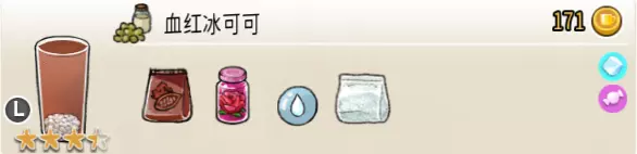 血色冰可可(大杯) 出售原价:171 状态:加冰,无糖/加糖 配方:可可×1+玫瑰糖浆×3+水×3,西米×1(小料,煮),搅拌 等级:3.5星