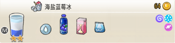 海盐蓝莓冰(中杯) 出售原价:64 状态:粗沙冰/细沙冰,无糖/加糖 配方:冷冻蓝莓汁×1 +(冰块×1 + 水×1,破壁)+ 海盐奶盖×1(最后加入,按序) 等级:2星