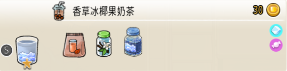 香草冰椰果奶茶(小杯) 出售原价:30 状态:加冰,无糖/加糖 配方:速溶奶茶×1+香草糖浆×1,椰果×1(小料),搅拌 等级:1星