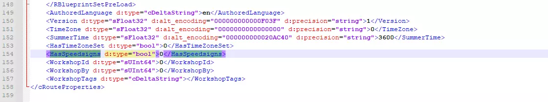 这显然非常令人沮丧,尤其是对于那些没有充分熟悉前方轨道的新玩家来说。通过了解,我看到许多关于这些明显隐藏的速度限制变化的抱怨,但除了“提升技术”之外,没有关于如何解决它们的建议!幸运的是,我通过一个相对简单的修复方法解决了这个问题,详细步骤将在本指南的其余部分说明。 ### 查找并编辑RouteProperties XML文件 通过更改RouteProperties.xml文件中的一个变量,我能够在HUD上添加缺失的速度限制。操作步骤如下: 1. 使用7-Zip(或类似工具),在你的Steam目录下找到RailWorks文件夹,然后在RailWorks→Content→Routes路径下找到相关的线路子文件夹。这些文件夹均会包含机器可读名称,并包含该路线的MainContent.ap(资源包)文件,以及您为该路线安装的任何创意工坊/第三方场景/内容。 使用7-Zip打开(但不要解压).ap文件,找到RouteProperties.xml文件。您可以打开此文件以再次确认是否位于正确的路线目录中。 将此XML文件另存一份副本到安全位置作为备份,然后使用合适的编辑器(例如Notepad++、Spyder等)打开它,并以新名称保存第三个副本,以禁用其编辑保护。这将成为我们的“修复文件”。 在修复文件中,找到文件末尾附近的HasSpeedsigns变量。如果该变量为1,请将其设置为0,如下方截图所示。保存所做的更改。