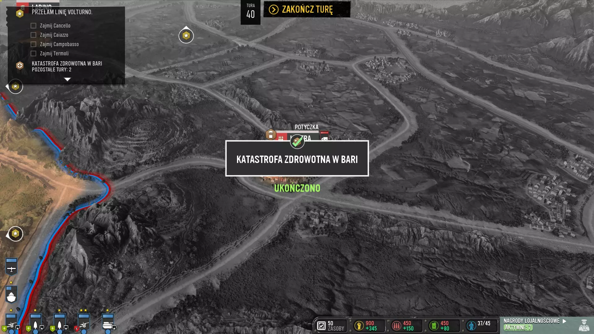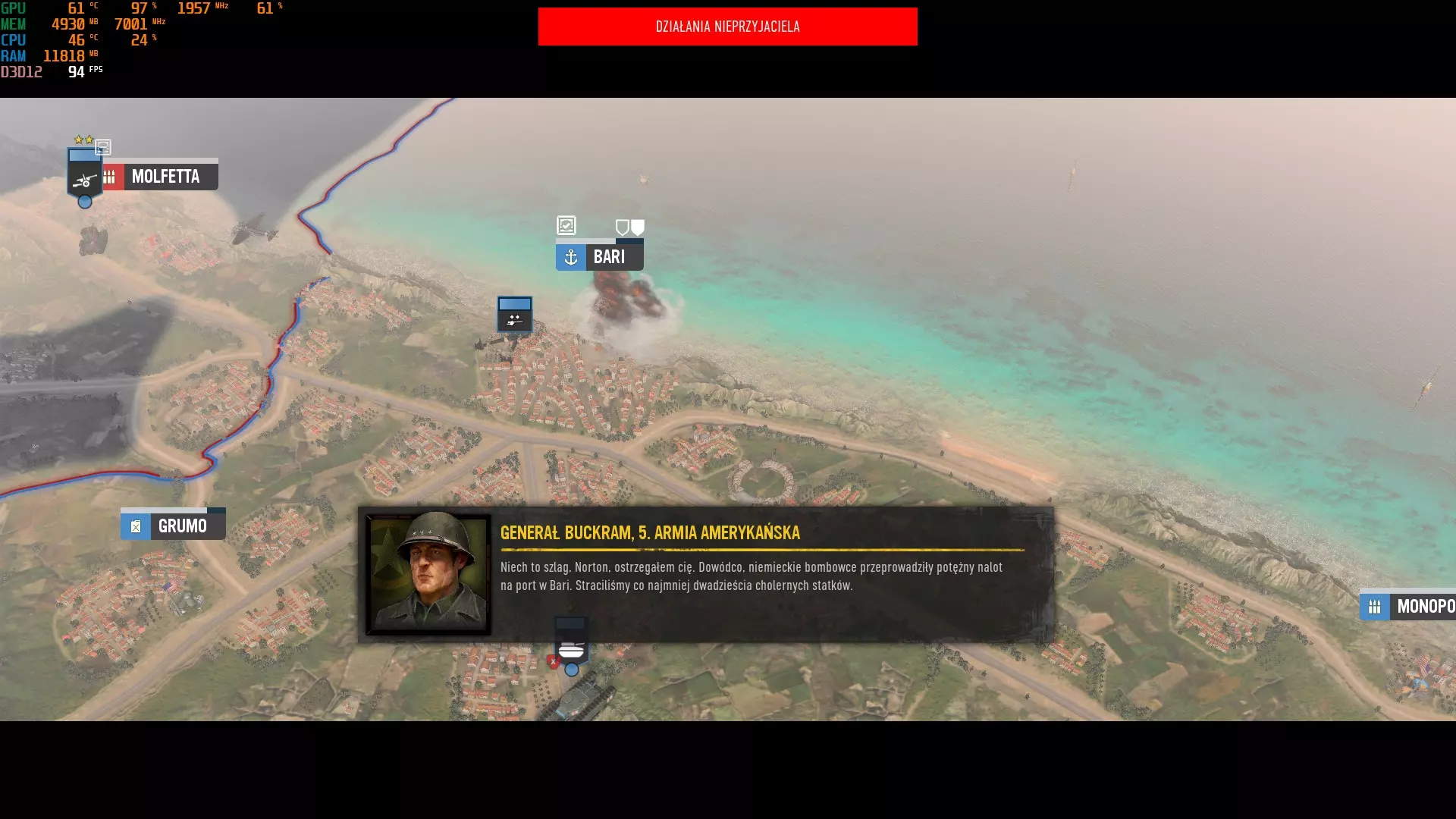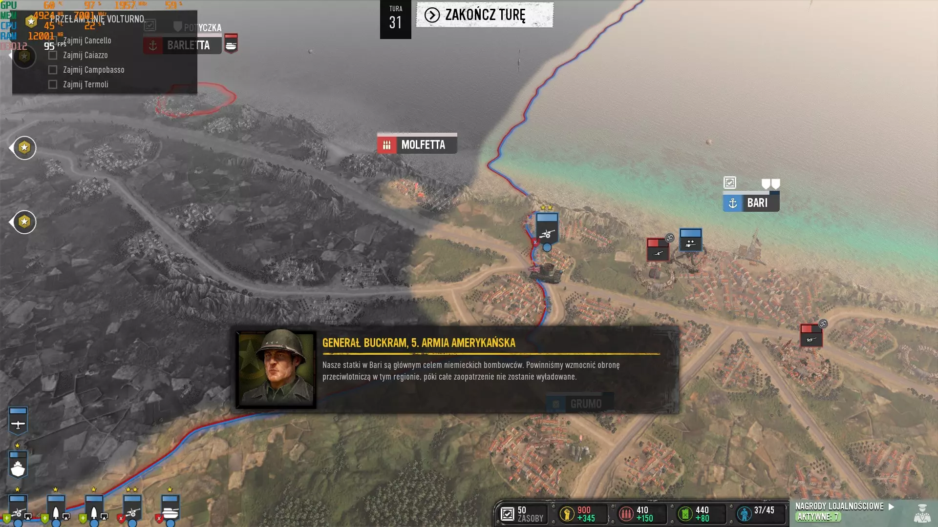 大家好,我将为大家介绍如何获取“Cover-up”成就。截图中的对话为波兰语,但并不重要,也可以随时进行翻译。这是我的第一篇攻略,希望能让大家看明白:)本文文字由翻译工具翻译而成。 步骤1 - 占领巴里港 在我看来,最重要的是不要占领巴里附近的机场,福贾最大的机场也同样不要占领。当我们接管巴里港后,在下一回合或几个回合内(可能是随机的),我们会收到消息,得知巴里是德国轰炸机的主要目标,我们应该加强防空防御。当然,我们不要这么做,继续等待即可。