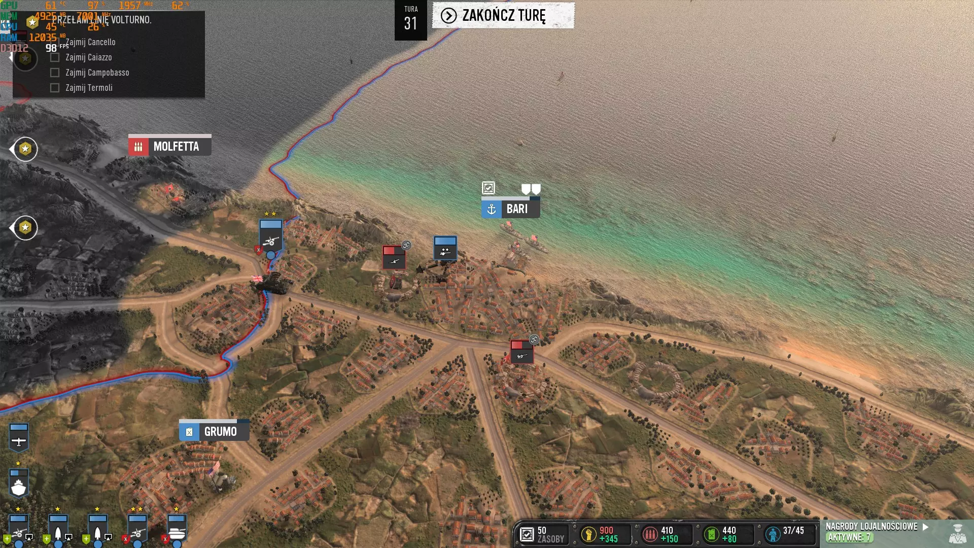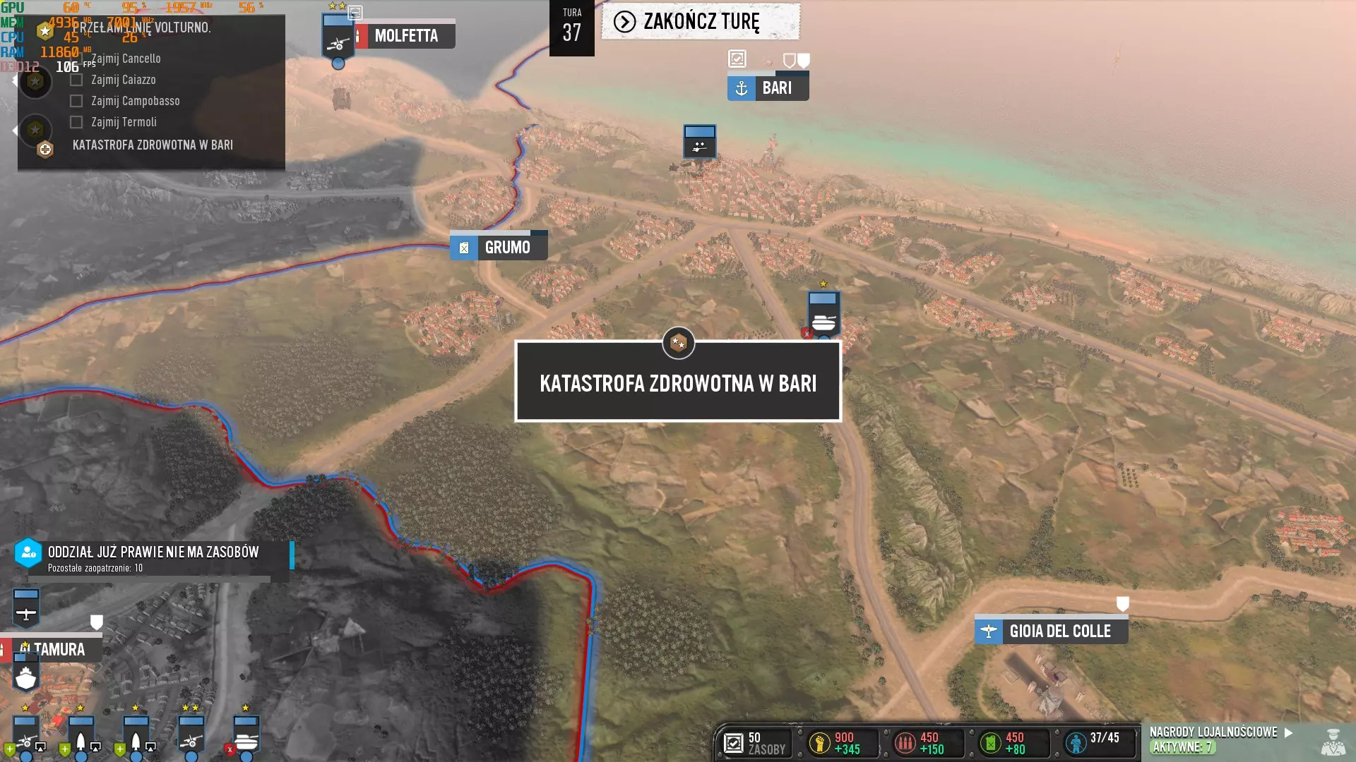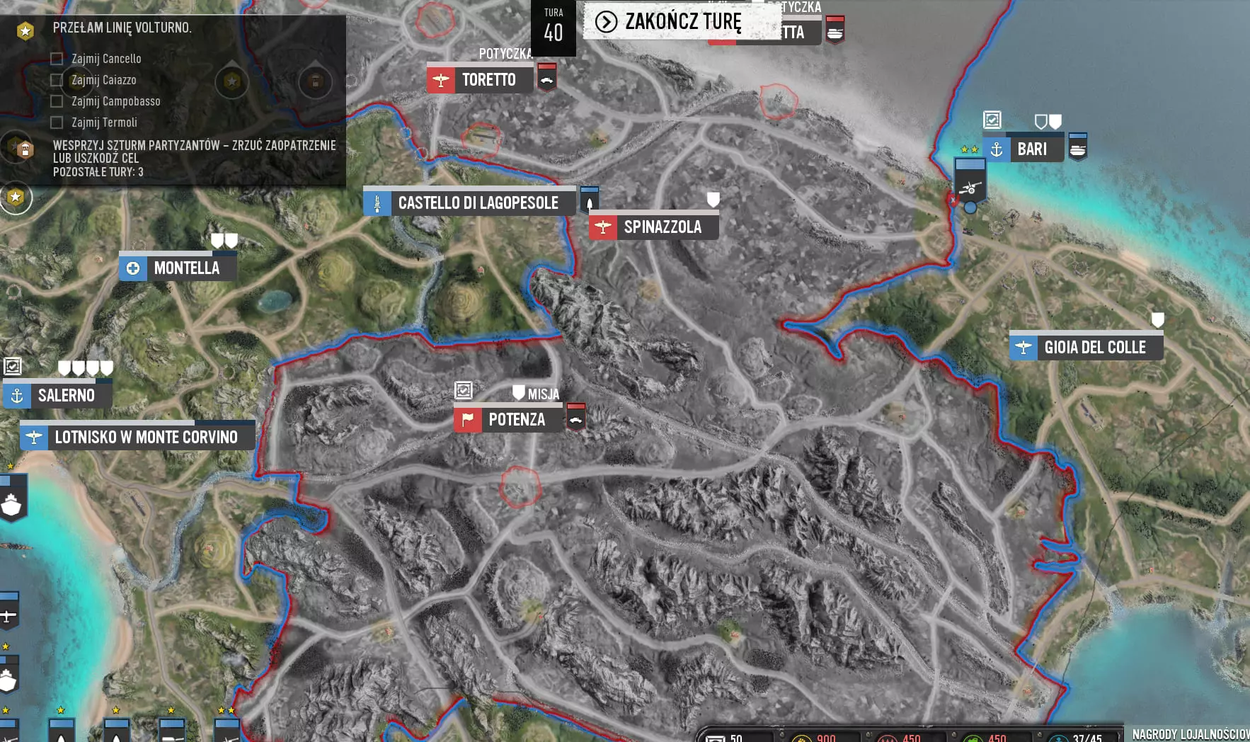 大家好,我将为大家介绍如何获取“Cover-up”成就。截图中的对话为波兰语,但并不重要,也可以随时进行翻译。这是我的第一篇攻略,希望能让大家看明白:)本文文字由翻译工具翻译而成。 步骤1 - 占领巴里港 在我看来,最重要的是不要占领巴里附近的机场,福贾最大的机场也同样不要占领。当我们接管巴里港后,在下一回合或几个回合内(可能是随机的),我们会收到消息,得知巴里是德国轰炸机的主要目标,我们应该加强防空防御。当然,我们不要这么做,继续等待即可。