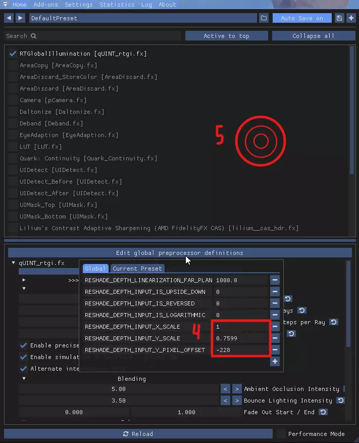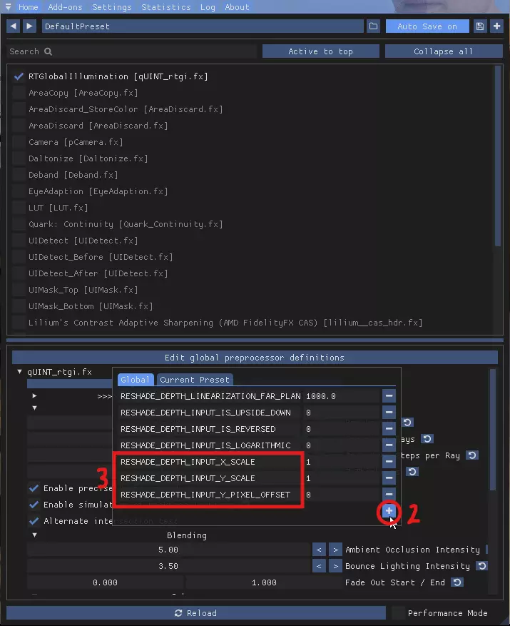 在“Global”(全局)部分,点击加号并填写生成的字段,输入以下相应文本。您需要创建三个字段,并填入以下文本: RESHADE_DEPTH_INPUT_X_SCALE RESHADE_DEPTH_INPUT_Y_SCALE RESHADE_DEPTH_INPUT_Y_PIXEL_OFFSET 4. 和 5.