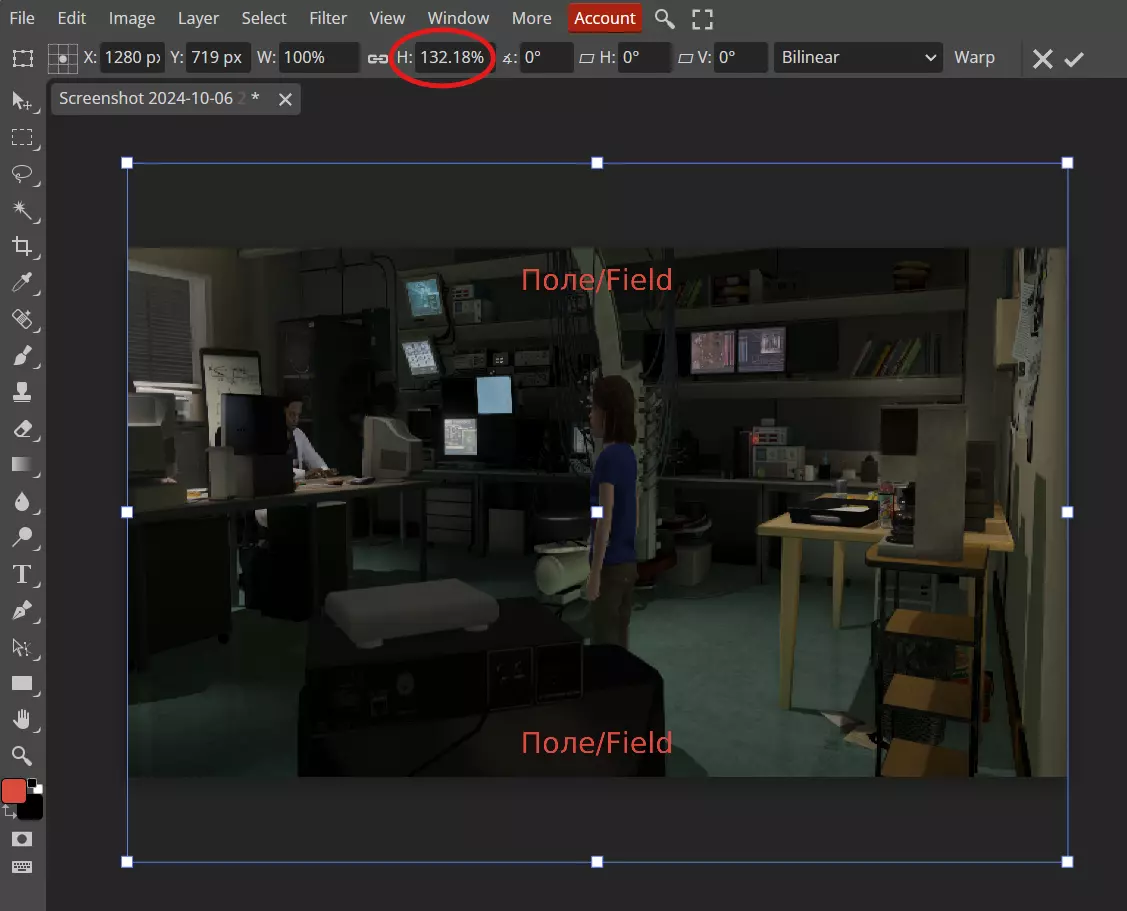 了解问题原因后,我们应按相同原则操作。在游戏中截取全屏截图,将其粘贴到方便使用的图片编辑器(我使用的是“photopea”网站),然后调整图片大小以适配画布。