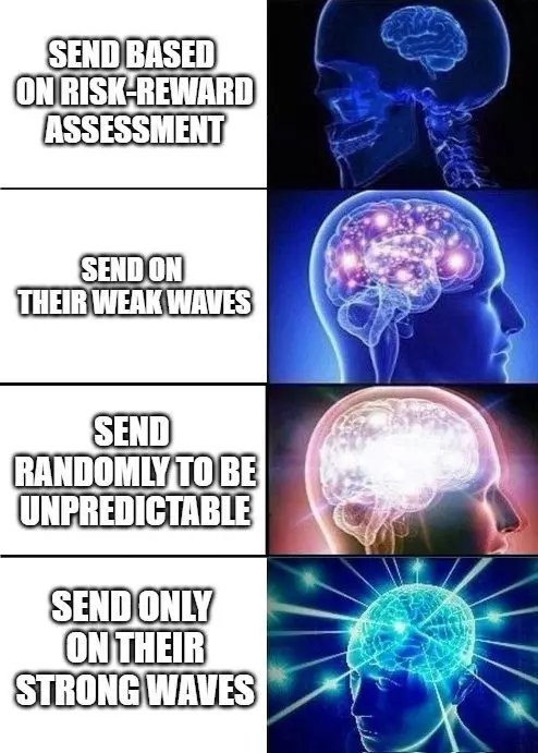 频繁消耗神话币(“发送”/“重发”) - 能最大化你从收入中获得的金币 - 适合你的阵容有良好成长性的情况(发送会导致游戏节奏放缓,经常进入后期) - 适合对手被低估的情况 - 适合你需要金币来购买特定斗士、额外工人或为下一波战斗获取额外收益的情况 保存神话币 - 会给对手施加压力,迫使他们保持较少的工人数量 - 有更高的几率造成大规模漏怪并赢得游戏 - 适合你的阵容成长性不佳的情况(保存会导致游戏节奏加快,很少进入后期) - 适合对手在特定波次非常虚弱的情况 - 适合你在特定波次非常虚弱,需要通过提前一波派遣雇佣兵来削弱对手的情况 保持不可预测性。总是重复同样的操作会让对手利用你的习惯。有时在对手强势的回合发起进攻能打他们个措手不及。进攻与防守相结合的混合策略往往是制胜的关键。