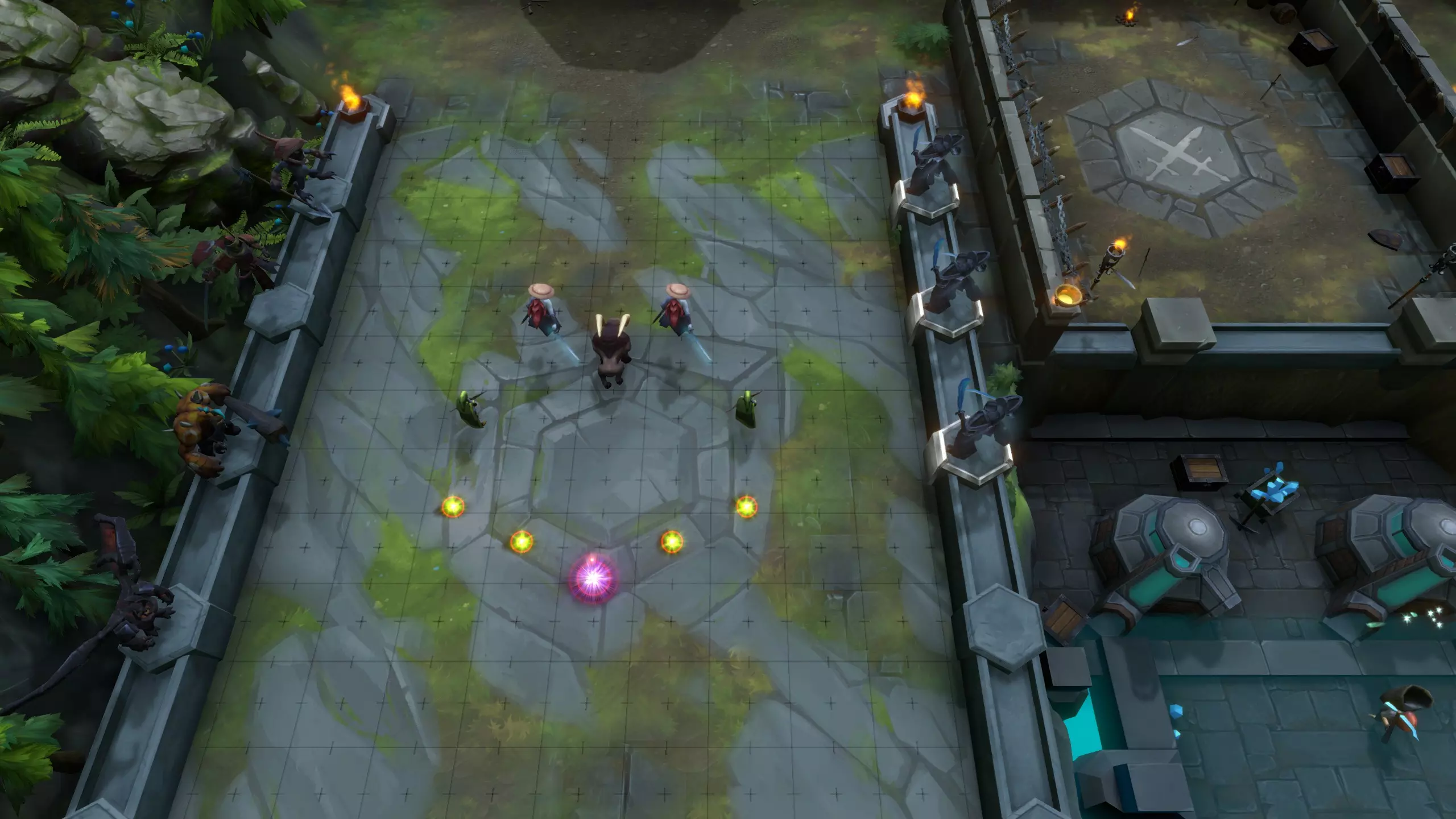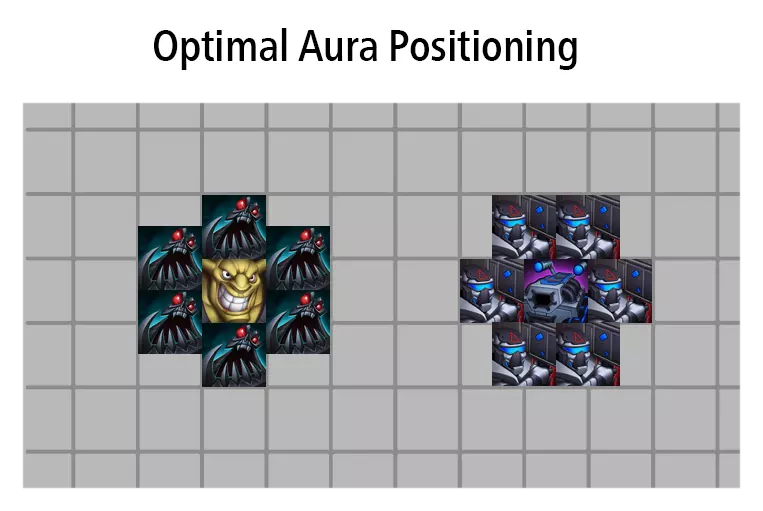 在后方。构建一个坦克和输出(DPS)的合理组合。 按每个斗士的坦度比例大致分配他们承受的伤害量。让拥有3000生命值的斗士比1000生命值的斗士先承受伤害是好的,但让3000生命值的斗士承受75%的波次伤害,同时让1000生命值的斗士承受25%的波次伤害会更好。这样做能最大限度延长你的斗士存活和造成伤害的时间。实现这一点的一种方法是分散部署你的斗士,在左侧和右侧各建造一些。 大多数光环最多影响6个相邻的斗士单位。光环效果将在整个战斗中持续作用于这6个斗士,即使光环单位距离很远或已死亡。