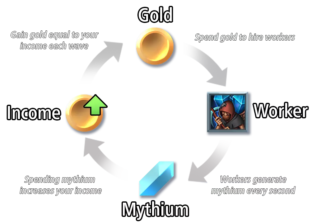 每当你消耗秘银时,你的收入会立即且永久提升。每个战斗阶段结束时,你将获得等同于当前收入的金币。在战斗阶段消耗秘银是个好策略,因为这能最大化你从收入中获得的金币。 收入是你过渡到游戏后期的关键。没有足够的收入,你将没有足够的金币来招募战士(战士价值)以清除后期的敌人波次。 高收入的雇佣兵和国王升级能提供最高收入。强力雇佣兵的收入较低,但拥有特殊能力。 军团法术