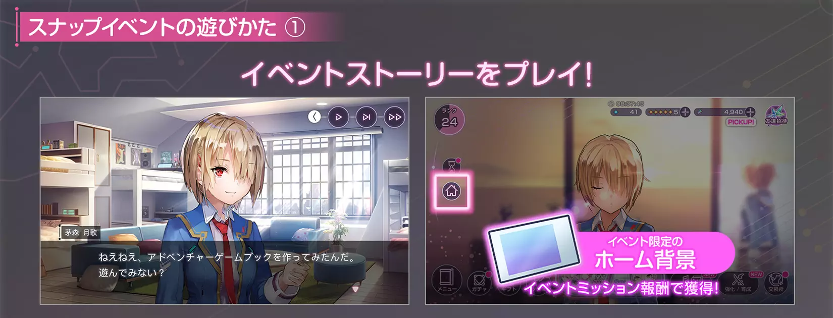 新形式的故事活动「快照活动」登场! 举办快照活动「数字城的魔法师」! 通关活动故事后,将解锁活动视觉图。 活动视觉图可通过任务作为「主页背景」获取! ▼宣传影片