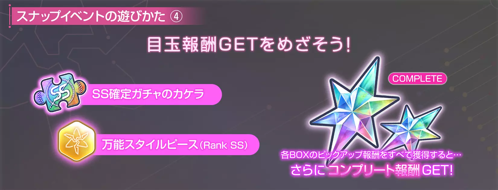 获得各BOX内的全部精选奖励后,即可获得“完成奖励”。 推进BOX,以获取核心奖励为目标吧! SS柳美音/松冈千乐登场!精选铂金扭蛋开启!