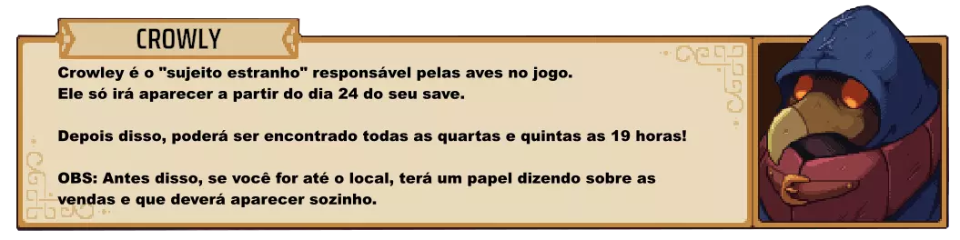 克劳利是游戏中负责鸟类相关事务的“神秘人”。他只会在你的存档第24天起出现。此后,每周三、周四的19点后都能找到他。 注意:在此之前,如果你前往该地点,会看到一张纸条,上面写着关于售卖的信息,并提示你应独自前往。 ★・・・・・・★・・・・・・★・・・・・・★ ⚜ ★・・・・・・★・・・・・・★・・・・・・★ 1. 前往你的酒馆南边,进入下一个区域(使用楼梯)。