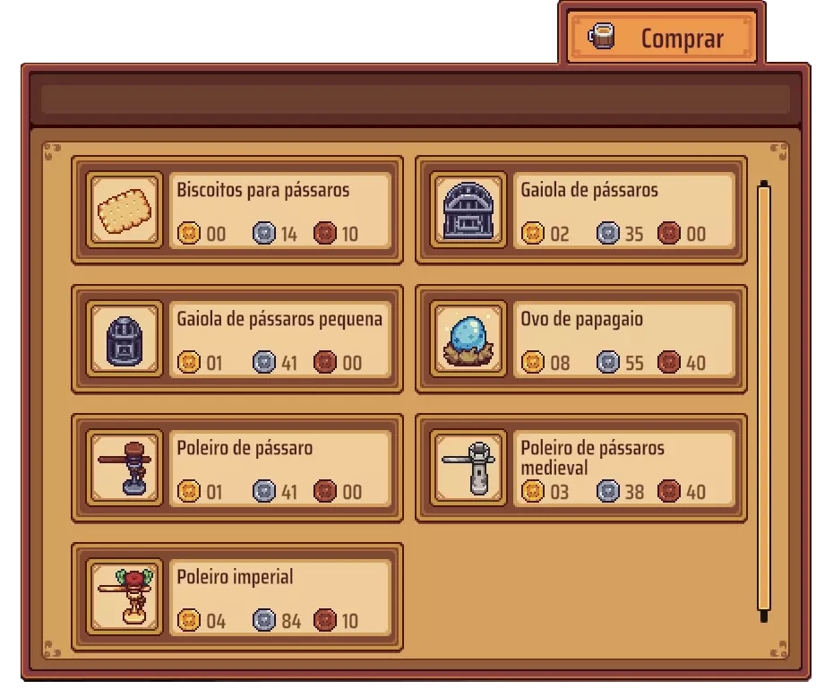 打印于2023年10月8日 推荐: 鹦鹉蛋 = 8奥罗56分 鸟栖木 = 1奥罗41分 鸟用饼干 = 15分/个 (需购买饼干总数:20个,共计3奥罗) 成就: