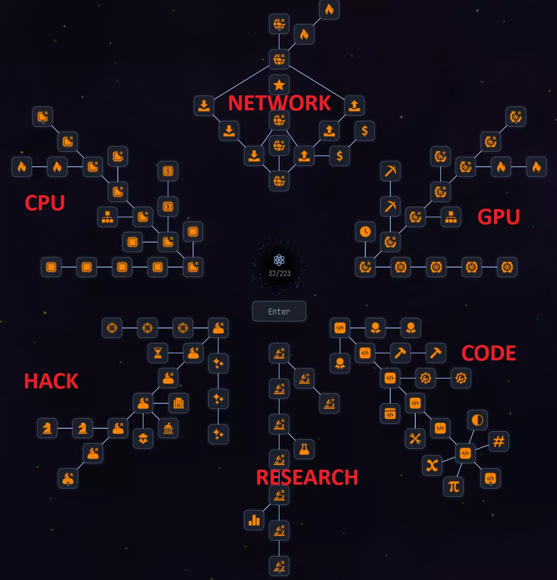 《传送门》技能树分为6个类别: - 网络 - 中央处理器(CPU) - 图形处理器(GPU) - 研究 - 黑客 - 代码 每个技能树都提供一条主路径以及带有不同升级的分支。所有升级都能显著提升游戏进度,以下是一些我认为帮助较大的升级: - **网络**:上传价值 - **中央处理器(CPU)**:初始处理器 + 1个额外CPU核心 - **图形处理器(GPU)**:额外集群 - **代码**:预编译(用于种子过滤器)、2倍预优化、4倍双变量编码 总体而言,升级点数应大致平均分配,初期可在“研究”上多投入1-2点。中期应更注重“网络”“中央处理器(CPU)”“图形处理器(GPU)”,后期则侧重“黑客”和“代码”。 ### 早期游戏:学习优化 **初始设置**: 开始时要利用所有可用的修饰符,借助网络和中央处理器(CPU)进行扩展非常重要。开始时: 我建议从网络和CPU资源中匀出10%专门分配给研究。 这样可以确保研究进度稳定,并且会随着你的升级而提升。